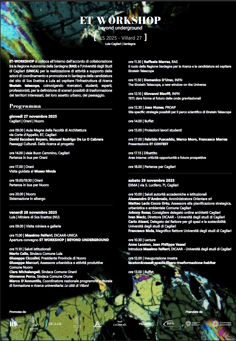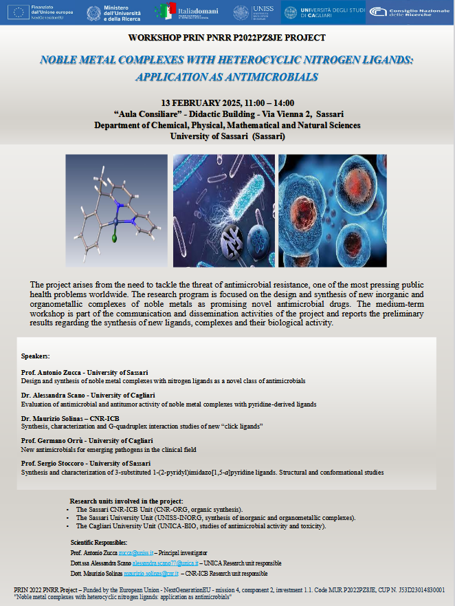 Workshop Conferenza della ricerca del dipartimento - DISCI ET WORKSHOP BEYOND UNDERGROUND_Prof. Domenico D'Urso Two days on mathematical modeling of desease evolution - Prof. Francesca Gladiali EUROGRANITES 2025The granite-migmatite connection in variscan northern Sardinia_Prof Leonardo Casini Qualitative Analysis_Prof. Francesca Gladiali Noble metal complexes with heterocyclic nitrogens ligands: application as antimicrobials_Proff. Antonio Zucca e Sergio Stoccoro Naviga la sezione Seminari Workshop Convegni Scuole Partecipazione ad eventi Incontri con gli studenti